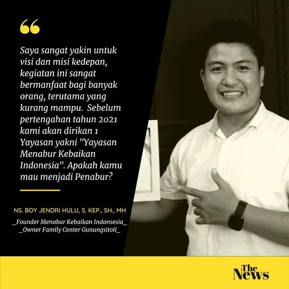 Yayasan Menabur Kebaikan Indonesia (YMKI) berdiri tahun 2021 dengan diprakarsai oleh seorang anak muda yang berjiwa sosial yakni Bapak Ns. Boy Jendri Hulu, S.Kep., SH., MH. beliau lahir di Pulau Nias pada tahun 1991 dengan latar belakang Ayah suku Nias dan Ibu suku Batak. pada awalnya beliau memulai ini saat beliau masih mengenyam pendidikan strata satu di salahsatu perguruan tinggi di Sumatera Utara, yang awalnya beliau mengunakan dana pribadi dan menghimpun mahasiswa yang memiliki jiwa sosial dan mau menolong orang lain. sehingga munculah motto yayasan sampai saat ini “Saya Senang Menolong Orang Lain”.